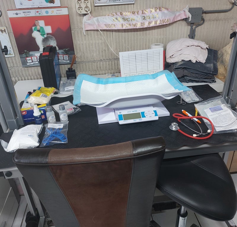 Vandaag heb ik de hele kraamkamer weer schoon gemaakt. Flink gesopt en opgeruimd. Daarna de werpkist neer gezet en de spullen klaar gezet die nodig zijn voor de bevalling. De kraamkamer is helemaal klaar. Vanavond heeft Ginny de kamer bekeken en geroken. Ze liep uit zichzelf de werpkist in en was overal aan het ruiken. Daarna heeft ze nog lekker bij mij gelegen en heb ik nog weer een pup voelen bewegen in haar buik.