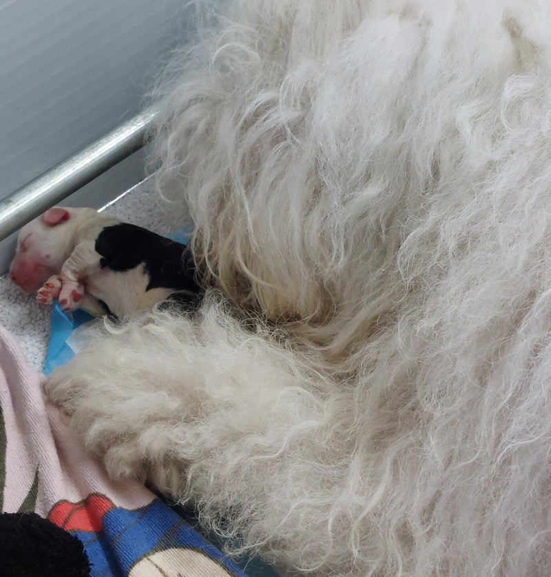 Om half 4 begon ze harder te persen en langer wat resulteerde in dat er een pupje werd uitgeperst. Echter deze was groot en bleef wat vast te zitten . Ik besloot haar te helpen, maar dit deed haar zo zeer dat ze mij beet. Dit is niets voor Ginny, want zo is zij helemaal niet.