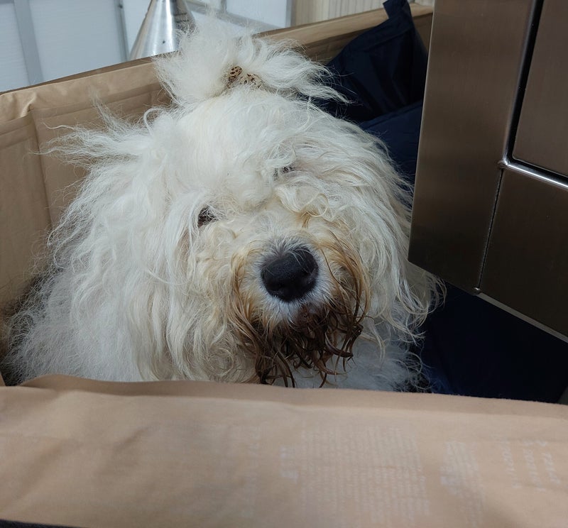 Het is alweer een paar dagen geleden dat de 3 puppy's weg zijn gegaan. Zaterdagavond hebben we Oesko gewassen. Hij had er ook niet zoveel zin in, maar was minder bang dan Ollie. Tijdens het knippen van de pootjes hebben we weer zo'n kauwbotje gegeven, waardoor ik makkelijk de haren tussen de voetjes kon weg knippen.