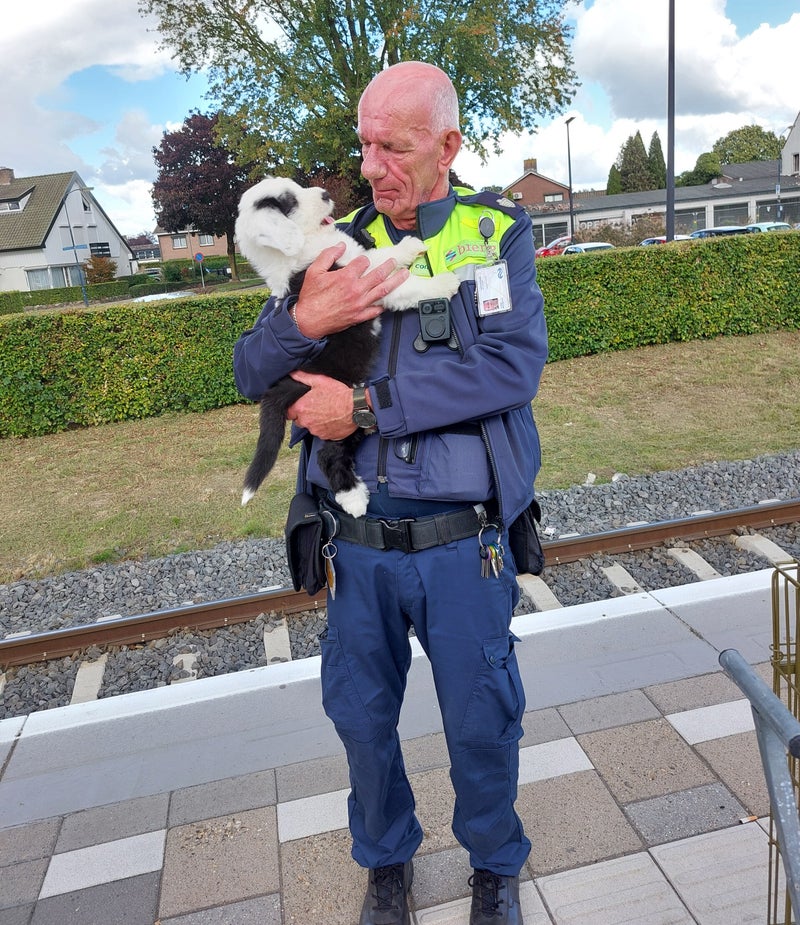 Er waren ook handhavers op het perron. Zij kwamen meteen na de puppy's kijken en aaien. Een van de handhavers vond Wobbel heel leuk en hield haar even vast.