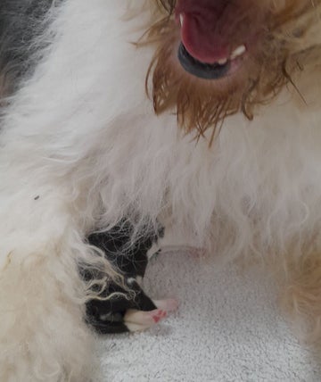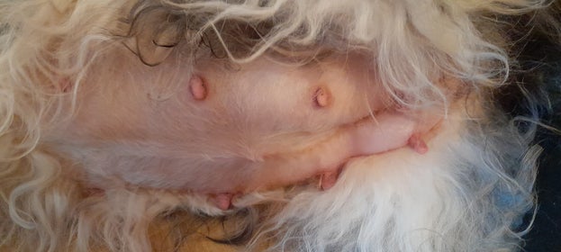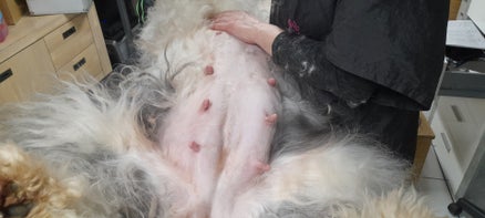 Hailey was aan de beurt om geborsteld te worden. Ze lag rustig op de trimtafel en toen zag ik dat ze in het begin van de loopsheid was.
